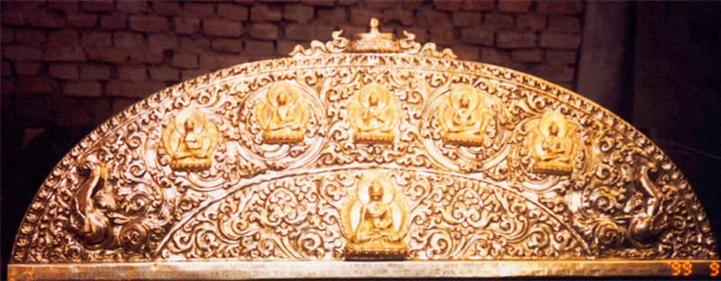 The metal work is an essential part of temples, Mahabhihars and Gompas. Generally the gajurs, roof, pinnacle, Ilan ( Ceiling decoration ) and torans ( entrance gate decoration ) of pagoda temples are made from copper and, if required, are gold plated.